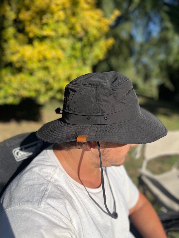 Cuenta con ala ancha para protección solar, paneles laterales de ventilación, cordón regulable al diametro y cordon regulable al cuello que garantiza un ajuste cómodo y seguro.